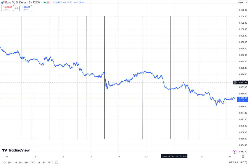 - The overnight range for EUR/USD was 1.0762 and 1.0808(Yesterday range was 1.0800 and 1.0820). I was proved wrong today because after breaking the 1.08 barrier yesterday, EUR/USD always stayed below that level overnight as well as during US market hours. The day range was 1.0765-1.0785. It can be been from the above graph that USD strengthening has been happening after US open 6/8 days in 2 weeks with unch move in other 2 days. Given those moves are on the back of Fed commentary being bearish as well on Trump winning US elections and given no reaction on outlandishly less US Existing Home Sales, I expect this trend to continue. Although tomorrow we might see a trend reversal but can only happen if US data is much worse than expected which in unlikely and hence expect the trend to continue. Therefore, my expectation for range is 1.0750 – 1.0775.