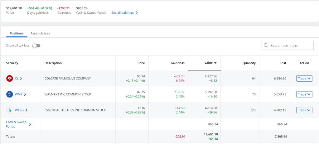The Colgate earnings hurt me almost 4% with it also dragging down WMT slightly on Friday. Overall the Colgate earnings were better than the expectation with it beating EPS as well as revenue but the market downtick reaction was on the sales decrease in Latin and North America. Overall I still want to stay in consumer defensive stocks and Colgate still seems like the best stock in the sector although my cost basis is significantly higher hence, my profit target now is 3%-5%, down from 10%.