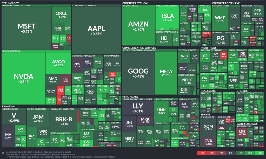 - TSLA led gains, closing up 4%, with all sectors also in positive territory.