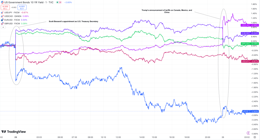 - Trump’s post-market announcement of tariffs on Canada, Mexico, and China erased 60-70% of earlier currency pair gains.