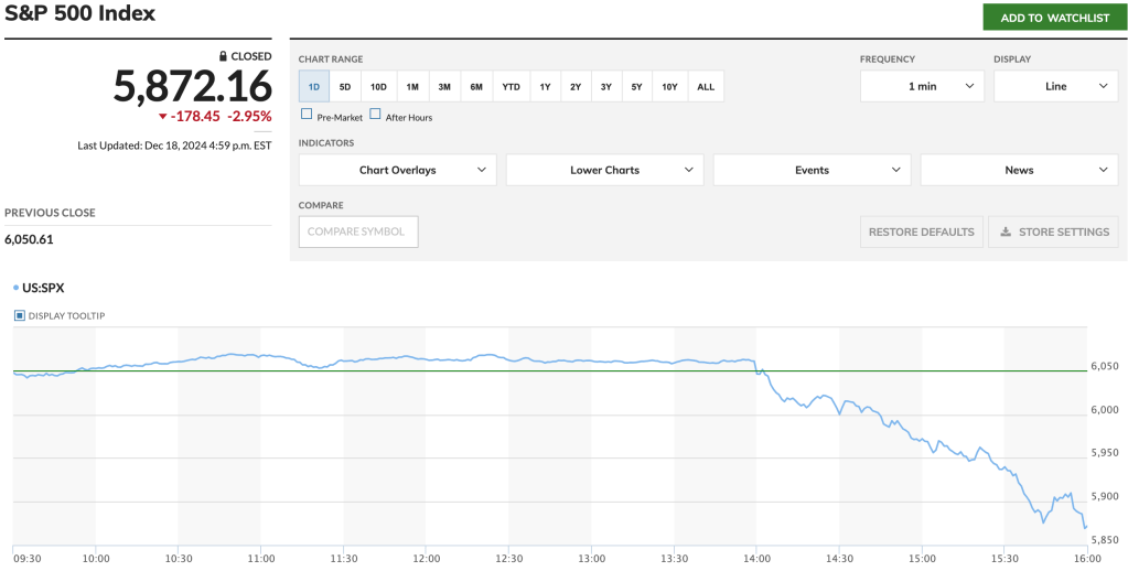 - Equities experienced a significant drawdown today, erasing half of the post-election gains. After the S&P 500 broke the 6000 level, it triggered some stop-losses, leading to further selling pressure, which may have caused an overreaction. I see a 1-1.5% chance of a bounce-back until the year-end.