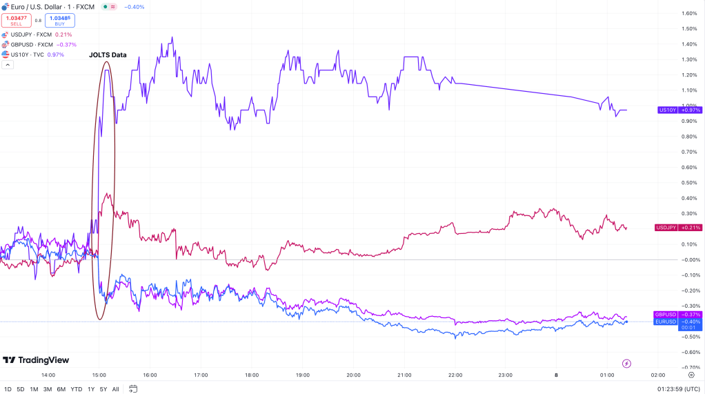 - Compared to other major FX pairs, USD/JPY has been the most stable, as I highlighted yesterday. This is evident in the chart above, where the pair recovered most of its value after the initial reaction to the JOLTS data release. This indicates strong resistance at the 158 level. However, given the strength of the US economy, the hawkish Fed outlook on interest rates, and the lack of clear signals from the BOJ regarding potential hikes, we are likely heading toward the 160 level this week.