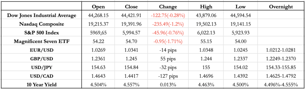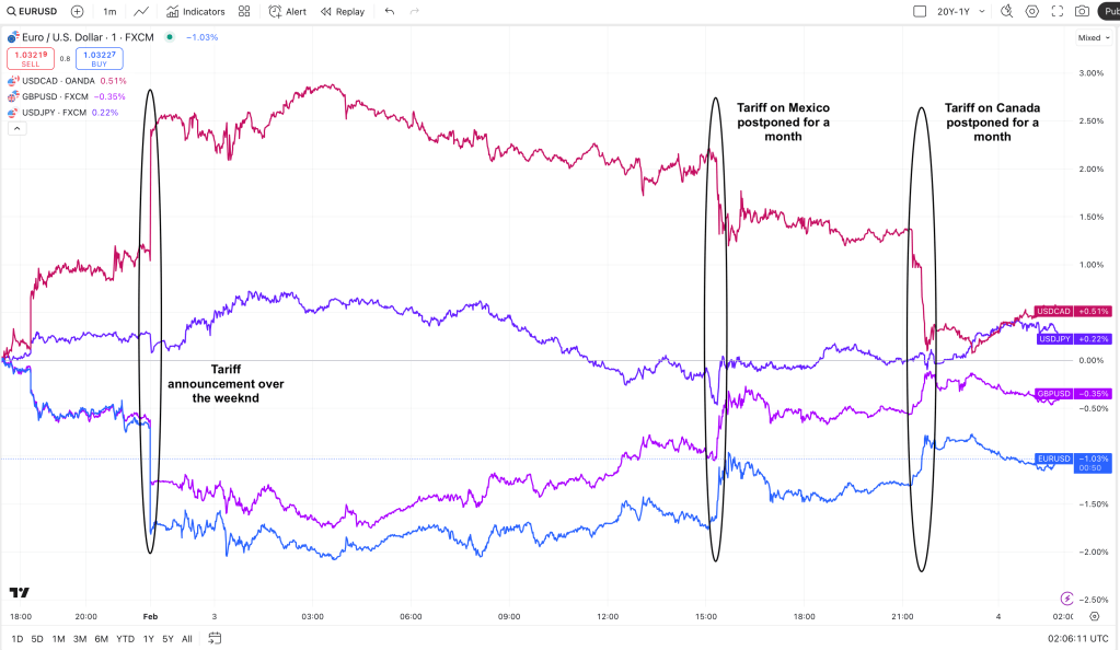 - Adding to the pressure, both Canada and Mexico signaled retaliatory tariffs, further weighing on their respective currencies. Equity markets also reacted negatively, opening down 2%, as investors priced in higher inflation risks and a delay in expected rate cuts.
