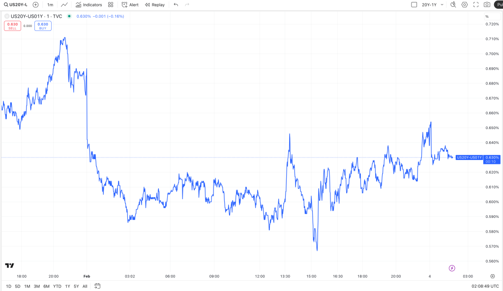 - Another notable development today was the decline in the spread between 20-year and 1-year yields, driven by a larger drop in back-end yields relative to the front end. This suggests either weaker future growth expectations or a shift in flows toward risk-free assets amid heightened uncertainty. However, the move more likely reflects a further delay in expected rate cuts, as the market reassesses the Fed’s path forward.